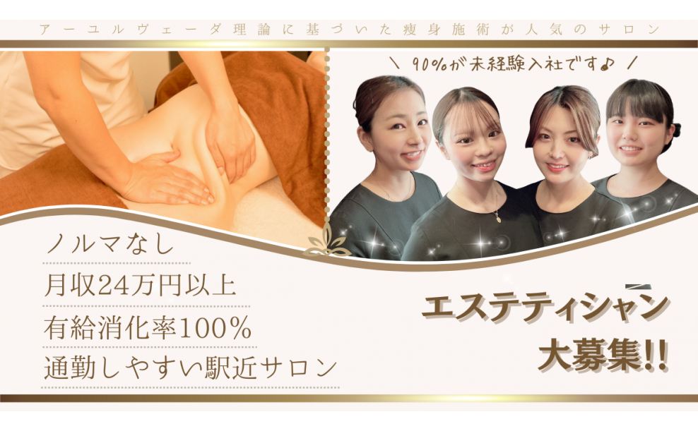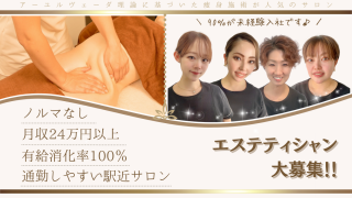 ☆☆☆サロン実習、社内技術チェックであなたの成長を後押し!☆☆☆ ・サロンでの実習があり,未経験者も安心♪エステ技術の基礎や接客,アーユルヴェーダ理論などを学べます。 ・月の始めにサロンの先輩と練習スケジュールを立てるので,計画的に技術を習得できます。 ・習得ペースに合わせて社内チェックを受けていただき、クリアすれば社内ディプロマ(証明書)を発行。自分の実力をきちんと把握できます。 キャリアのある方は,今後の経営戦略など,店舗運営計画をお任せします。 ぜひ今まで培ったスキルを活かしてください(^^) ☆☆☆働きやすい条件を揃えています☆☆☆ ・実績に応じて年3回の賞与支給あり!諸手当もご用意しています。 ・月9日休みです。希望休(月2日間)は土日、祝日に休むことができるので、プライベートも大切にできます。 ・有給休暇が取得しやすく、取得率は100%です。(年間の有給計画によって消化できます) 「手に職をつけたい」、「技術の幅を広げたい」、「サロンの運営に関わりたい」など、さまざまな意欲に応える職場環境を整えていますので、ぜひご応募ください! |