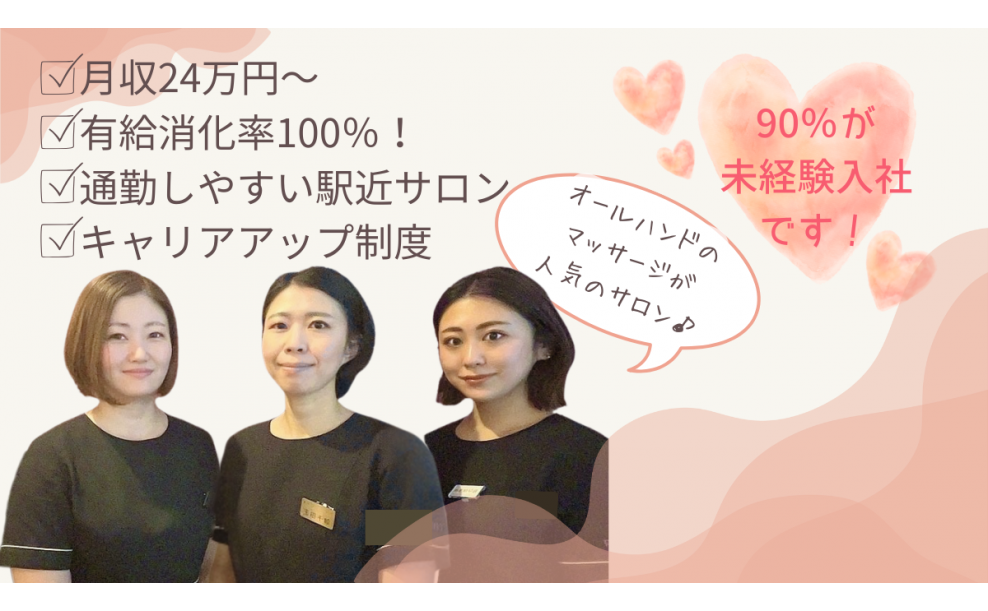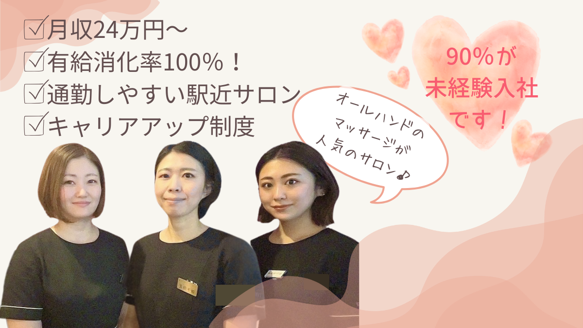 ! 未経験OK ! 学歴不問 ! 資格不問 ★90%が未経験入社です★ スタッフの前職は事務職や、居酒屋アルバイトなど様々。 未経験でも「成長したい!」という気持ちがあればOK♪ 前職 営業事務 27歳スタッフ 「事務職からの転職でした。 入社半年から技術チェックがあるなど、スキルアップ、キャリアアップのチャンスがあり成長に繋がると思い入社しました。」 前職 アパレル販売 32歳スタッフ 「未経験で入社しましたが、自分の努力次第で成長を認めてもらえる制度がうれしく、楽しみながら頑張れます!」 \こんな方大歓迎♪/ ●美容が大好きな方 ●技術の幅を広げたい方 ●手に職をつけたい方 ●人と接することが好きな方 ●マッサージが大好きな方 ●エステ・美容関係経験者 ●将来独立を考えている方 |