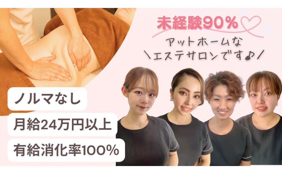 ☆☆☆サロン実習、社内技術チェックであなたの成長を後押し!☆☆☆ ・サロンでの実習があり,未経験者も安心♪エステ技術の基礎や接客,アーユルヴェーダ理論などを学べます。 ・月の始めにサロンの先輩と練習スケジュールを立てるので,計画的に技術を習得できます。 ・習得ペースに合わせて社内チェックを受けていただき、クリアすれば社内ディプロマ(証明書)を発行。自分の実力をきちんと把握できます。 キャリアのある方は,今後の経営戦略など,店舗運営計画をお任せします。 ぜひ今まで培ったスキルを活かしてください(^^) ☆☆☆働きやすい条件を揃えています☆☆☆ ・実績に応じて年3回の賞与支給あり!諸手当もご用意しています。 ・月9日休みです。希望休(月2日間)は土日、祝日に休むことができるので、プライベートも大切にできます。 ・有給休暇が取得しやすく、取得率は100%です。(年間の有給計画によって消化できます) 「手に職をつけたい」、「技術の幅を広げたい」、「サロンの運営に関わりたい」など、さまざまな意欲に応える職場環境を整えていますので、ぜひご応募ください! |