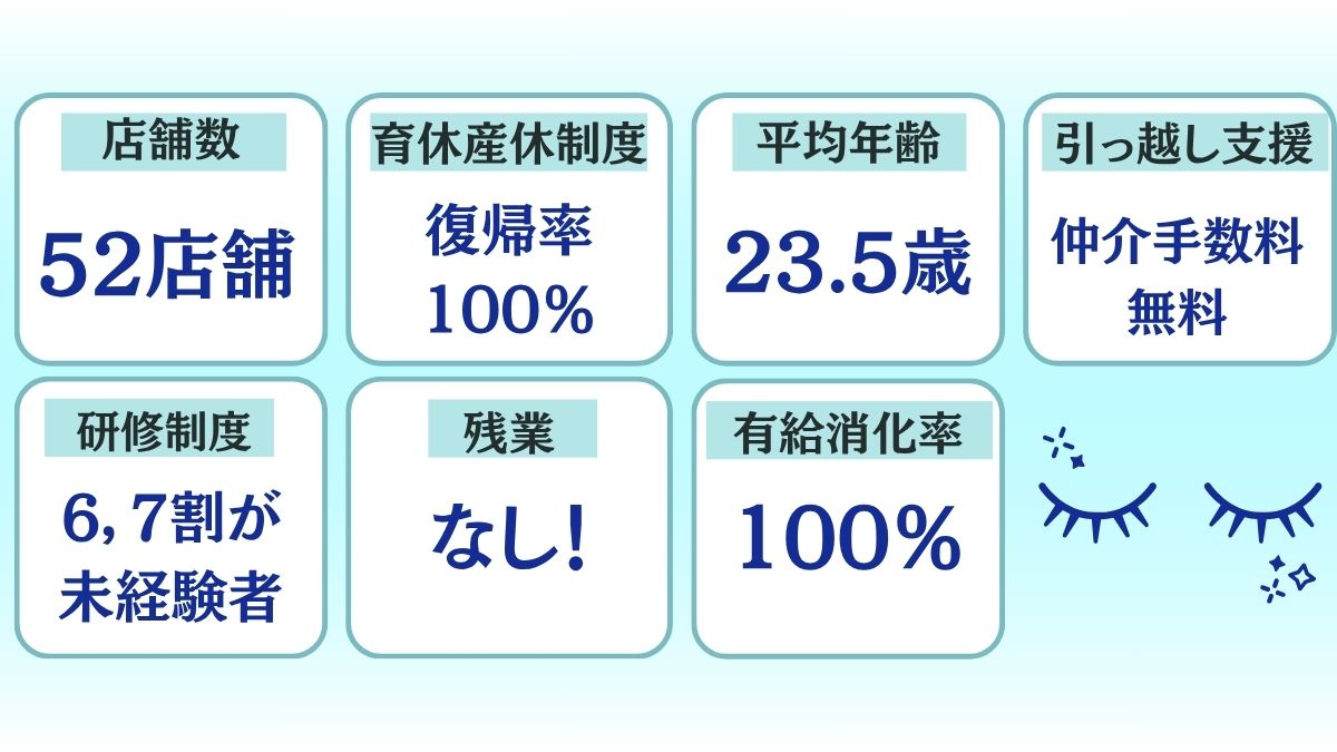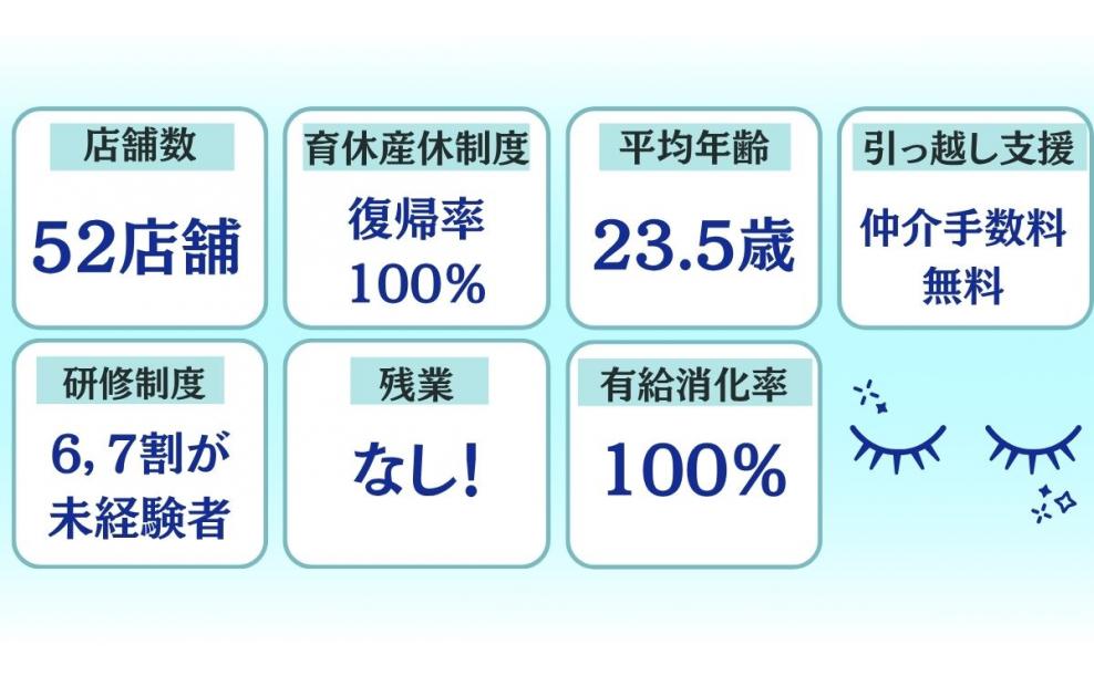 ・社会保険完備 ・交通費(上限3万円) ・眉毛、まつ毛月1無料 ・育休産休制度 ・引越しの際の仲介手数料無料 ・管理美容師/ディプロマ受講料負担 ・半休取得◎ ・健康診断 |