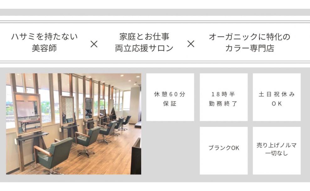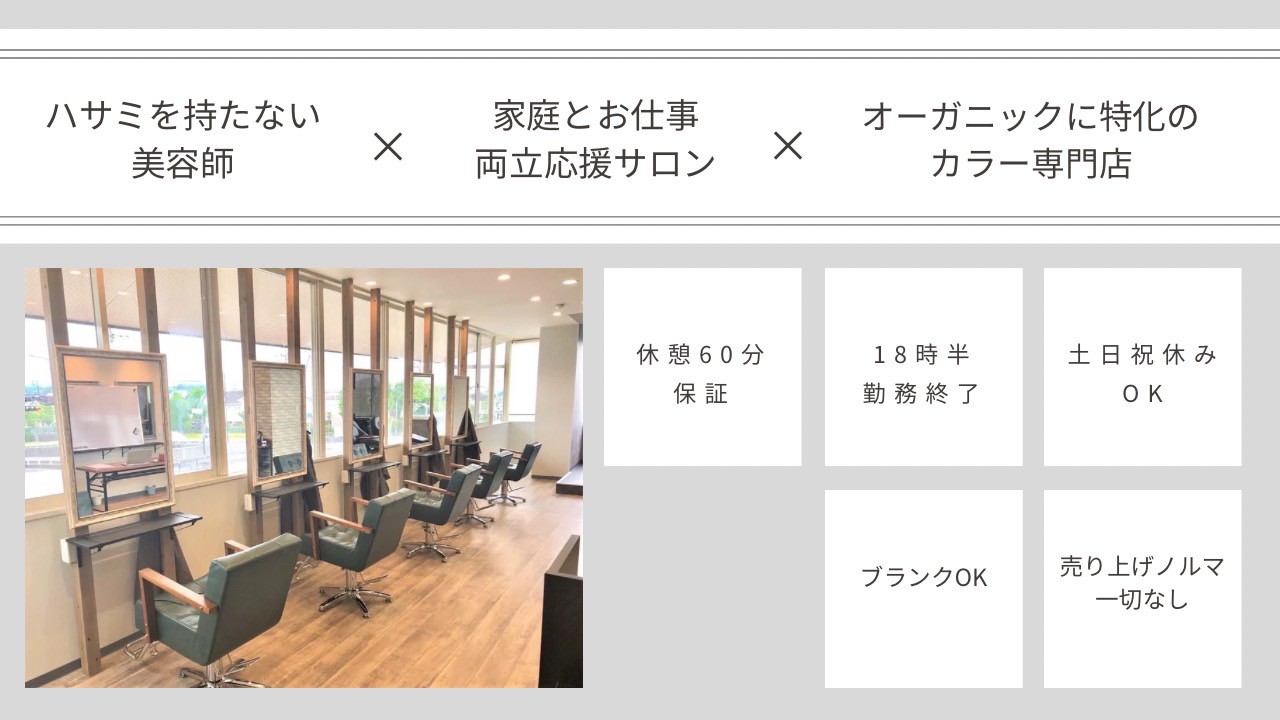 【千葉市緑区おゆみ野】《ハサミを持たない美容師と言う働き方》家庭・子育て・趣味と両立可能♪ 仕事とプライベートの両立応援サロン◎オーガニックに特化! \\休憩しっかり60分保証// 《ハサミを持たない美容師と言う働き方応援サロン》 《美容師とプライベートの両立応援サロン》 《子育てと美容師の両立応援サロン》 『オーガニックに特化したヘアカラー専門店 商材、商品は全てオーガニックにこだわった物を選び、お客様の髪と地肌にやさしいオーガニックカラーを提供しております』 《特長》 ◎土日祝日のお休みOK プライベート充実出来ます♪ ◎18時半で上がれ、アフタ―の充実♪ ◎希望通りの休みをとれます。 ◎お昼休憩は毎日しっかりと取れます。 ◎完全週休2日 しっかりお休みが取れます♪ ◎指名制、担当制、ノルマはありません。 ◎社内研修でブランクがあっても未経験でも安心♪ ◎グレーカラーのみ、難しいカウンセリングはありません ◎有給休暇もしっかりあります。 ◎時間外練習なし 練習に付き合う事ありません。 ◎キャリアアップのアイリストやスキルアップ制度もあり 美容師だから、土日は休めない。。。 美容師だから、仕事の日は友達と会えない。。。 美容師は好きだけど、スタイリスト希望はない。。。 美容師しながら、子育て、家庭を両立させたい。。。 可愛く素敵なサロンで働きたい。。。 お客様へは本当に良い物を提供したい。。。 弊社なら、その悩みを解決出来ます。 是非、美容師としての働き方でお悩みの方、 ご応募お待ちしております♪ |