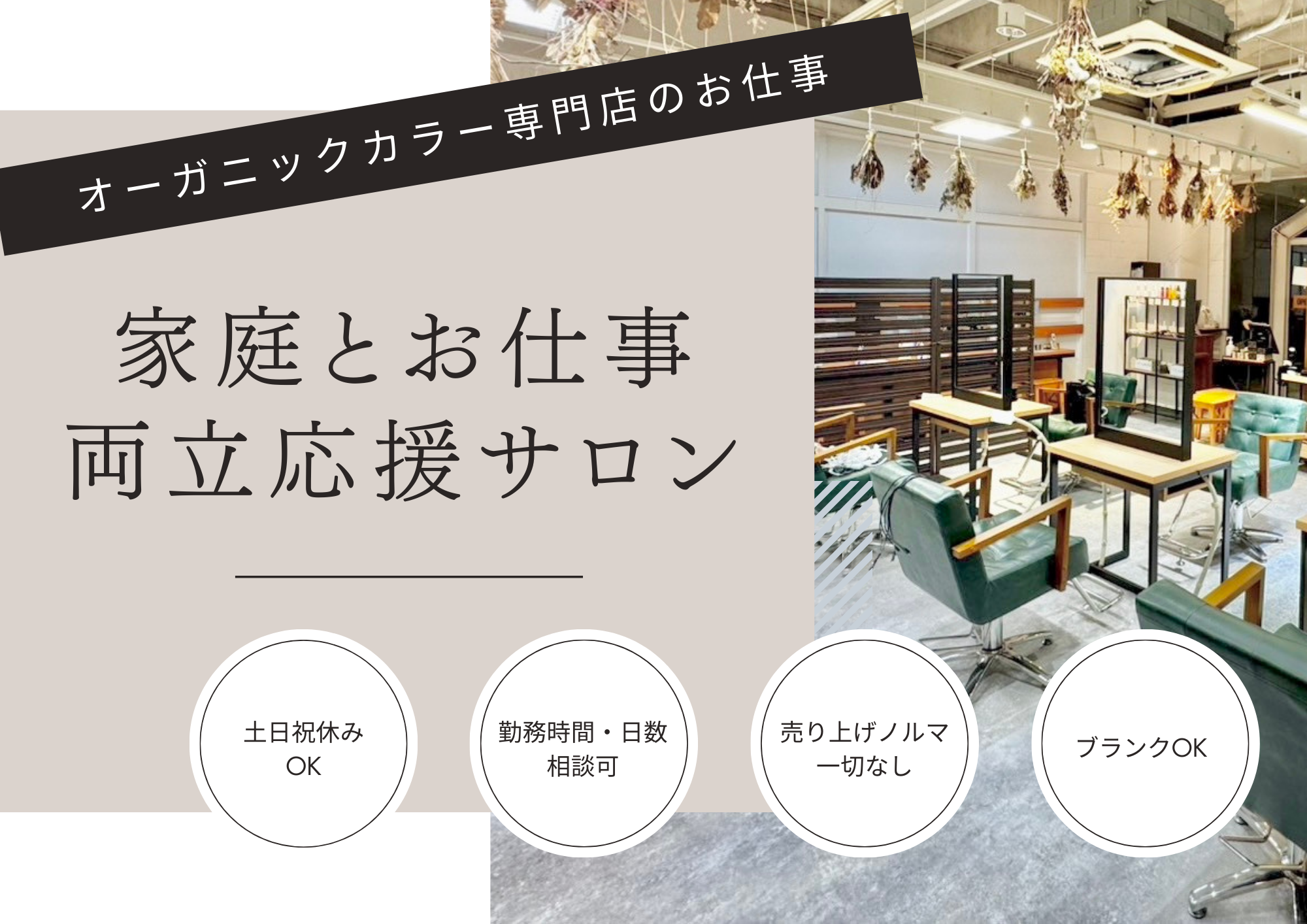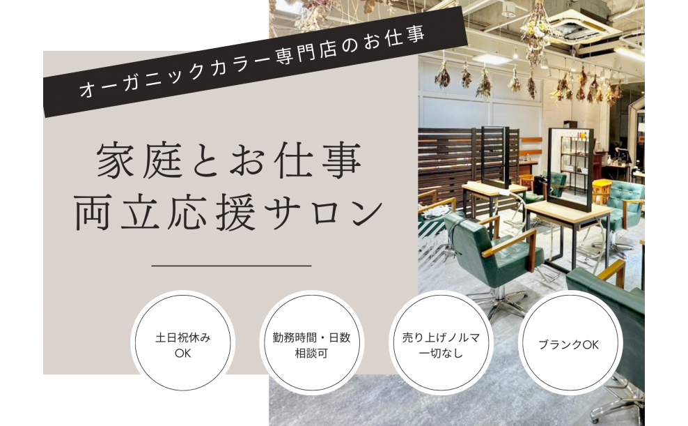 【緑区土気あすみが丘】ハサミを持たない新しい美容師の働き方 家庭・子育て・趣味と両立OK♪ ◎オーガニック特化 ◎扶養内OK ◎扶養外 ■ 当サロンはこんな働き方を応援しています 《ハサミを持たない美容師という働き方応援サロン》 《美容師とプライベートの両立応援サロン》 《子育てと美容師の両立応援サロン》 当店は オーガニック特化のヘアカラー専門店 です。 商材・商品はすべてオーガニックにこだわり、 髪と地肌にやさしいカラーを提供しています。 ■ 特長(働きやすさポイント) 《柔軟な働き方ができる》 ・お子様の行事に合わせてお休みOK ・平日のみOK ・土日のみOK ・週1回~OK ・扶養内・扶養外どちらもOK ・1日3時間~の時短勤務OK 《時間にゆとりのある働き方》 ・上がり時間のずれ込み一切なし ・残業ほぼなし ・毎日お昼休憩しっかりとれます 《美容師の負担を軽減》 ・指名制・担当制・ノルマなし ・グレーカラーのみで難しいカウンセリングなし ・時間外練習なし(練習に付き合う必要もなし) ・社内研修でブランク・未経験でも安心 《スキルアップ可能》 ・アイリストなどキャリアアップ制度あり ■ こんな方にピッタリ 子育てが落ち着いて、美容師に復帰したい… 美容師は好きだけどスタイリスト希望はない… 家庭と仕事、どちらも大切にしたい… 可愛くて素敵なサロンで働きたい… 本当に良い商材でお客様に喜んでもらいたい… そんな思いを、当サロンなら叶えられます。 ■ 最後に ママ美容師さんの働き方を全力で応援しています(^^)/ あなたのペースで、無理なく、美容師を楽しみませんか? ご応募お待ちしております♪♪♪ |
