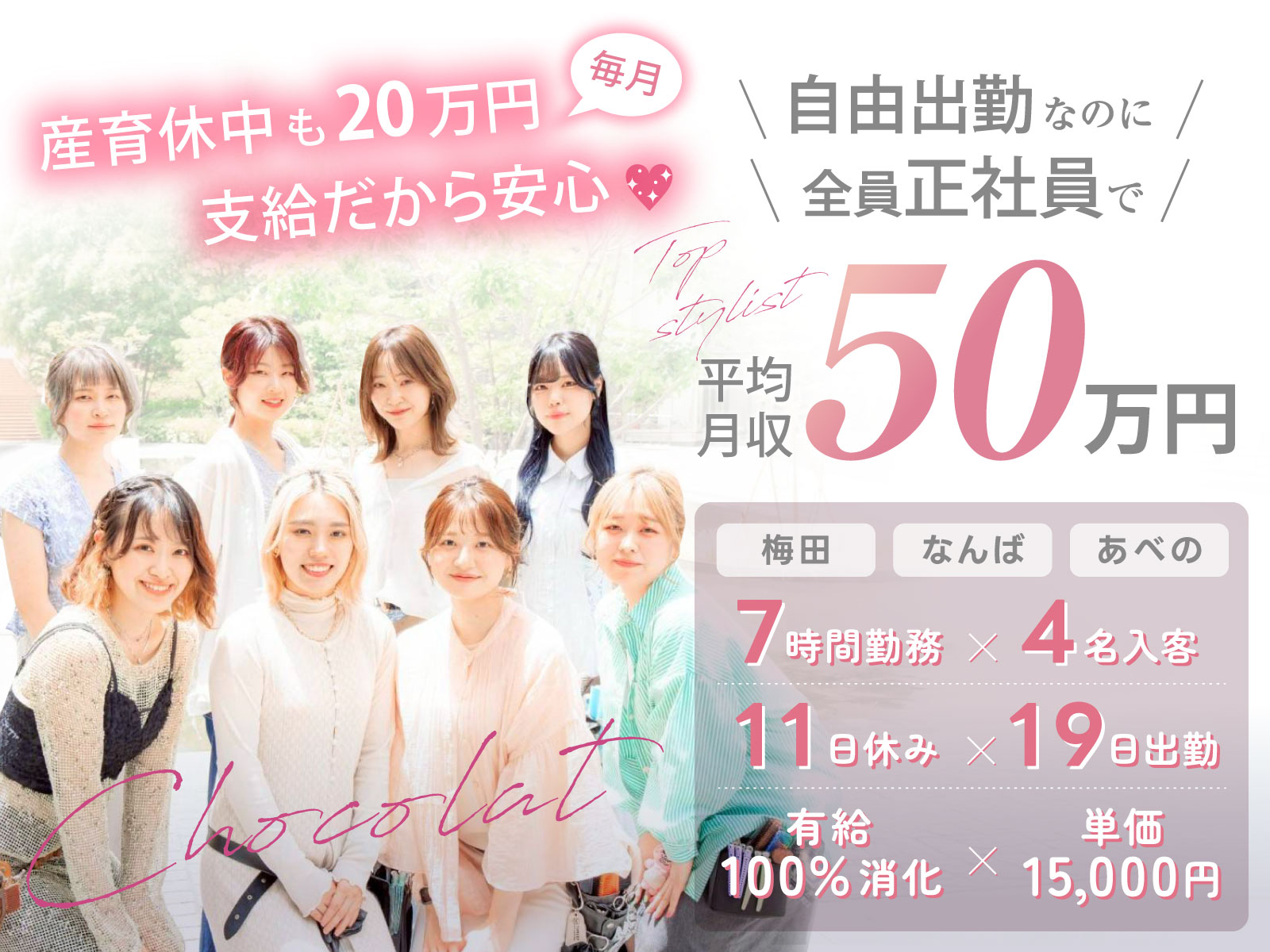 ショコラ梅田はスタッフ同士のチームワークが最高です。働く上で人間関係は 凄く凄く大切です。特に笑顔と挨拶を大切にし、 元気で心優しい女性美容師ばかりです。 なので是非一度「見学」や「施術体験」にご応募下さい!