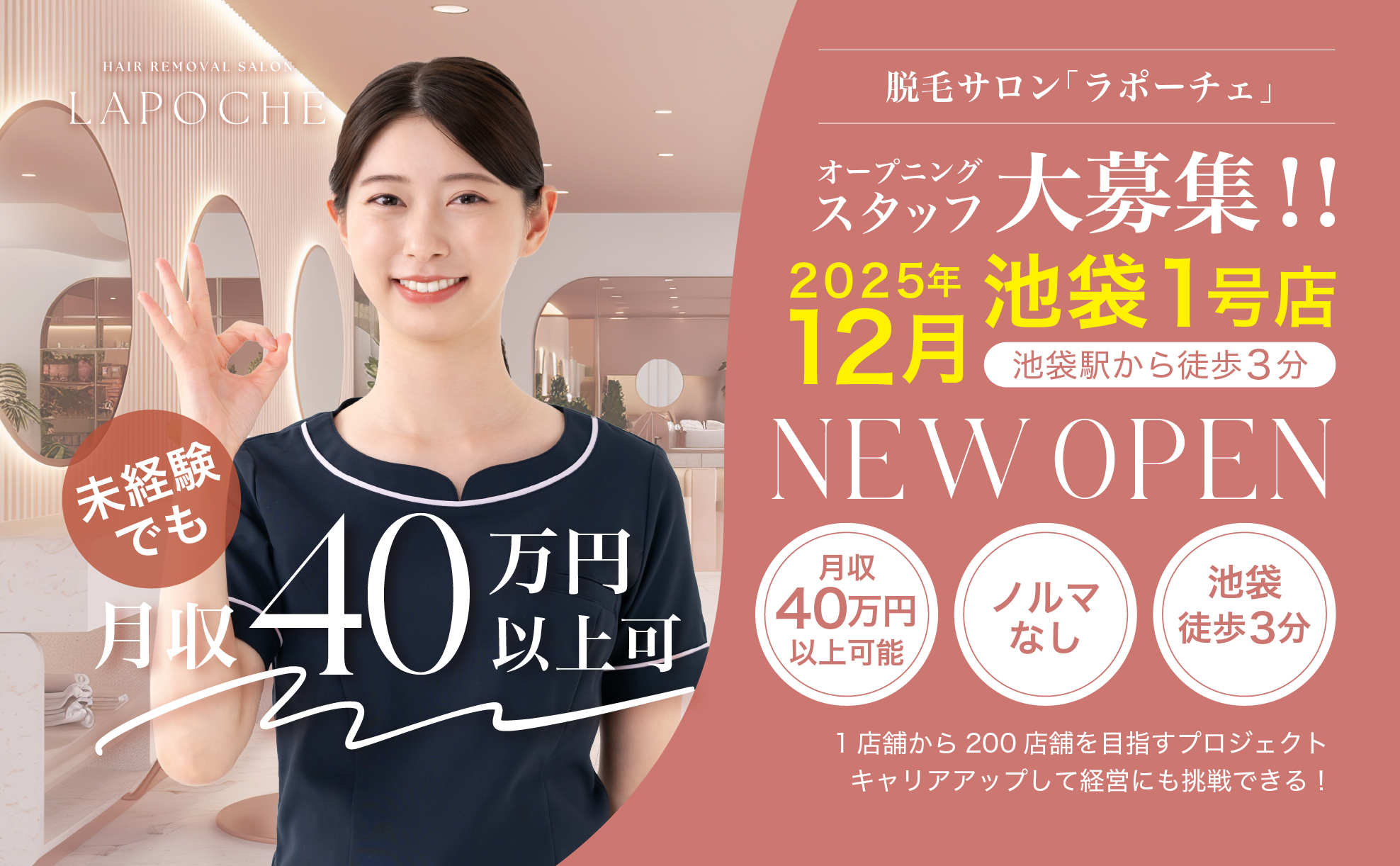 「美容の仕事に興味はあるけど、未経験だから不安…」 そんな方も安心してスタートできる環境をご用意しています。 当サロンでは、入社後すぐにお客様対応をお任せすることはありません。 まずは充実した研修制度で、脱毛機の操作や肌の知識、接客マナーを丁寧に学びます。 研修中は、先輩スタッフがマンツーマンで寄り添い、疑問や不安を一緒に解決。 実際にお客様を担当するのは「自信がついてから」で大丈夫です。 また、定期的に研修会や勉強会を開催し、新しい技術や美容知識も常にアップデート。 全員で成長を喜び合える“チームワーク重視”の職場だから、困った時はすぐに相談できる雰囲気です。 「美容が好き」「誰かをキレイにする仕事がしたい」 その気持ちがあれば、経験は問いません。 あなたも私たちと一緒に、お客様の笑顔をつくるお仕事を始めませんか? ❤️研修制度と先輩の寄り添いサポートで安心 入社後は基礎から丁寧に学べる研修制度あり。 お客様デビューまで先輩がマンツーマンで寄り添い、不安や疑問はその場で解決。 自信を持って施術できるようになってからお任せします。 ❤️チームワーク重視の温かい雰囲気 スタッフ同士で助け合い、成功や成長を一緒に喜べる職場です。 女性中心でもギスギス感ゼロ。新人さんもすぐに馴染めます。 ❤️ノルマなしでストレスフリー&高収入可能 固定給+インセンティブ制度で、未経験でも月収40万円以上が可能! ノルマがないから、数字に追われずお客様満足に集中できます。 希望休も取りやすく、プライベートと両立できます。 ❤️明確なキャリアアップ制度 技術を磨けばチーフや店長への昇格も可能。 資格取得支援や外部研修もあり、美容業界で長く活躍できます。 こんな方にぴったり! • 美容が好き、人をキレイにする仕事がしたい • 未経験からスキルを身につけたい • 高収入と安定を両立したい • チームで助け合いながら成長したい ✅【駅近】 ・池袋駅から徒歩4分でアクセス抜群 ・仕事帰りに買い物や友達とのご飯も楽しめる ✅【オープニング】 ・ピカピカの新店舗で働けるワクワク感 ・同期入社で仲間意識が強い! ・自分たちでサロンの雰囲気を作れる自由度 ✅【美容メーカー直営】 ・最新の機器・商材で安心の施術 ・美容が好きな方には嬉しい高品質な環境 |
