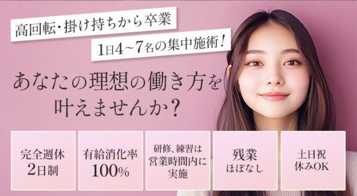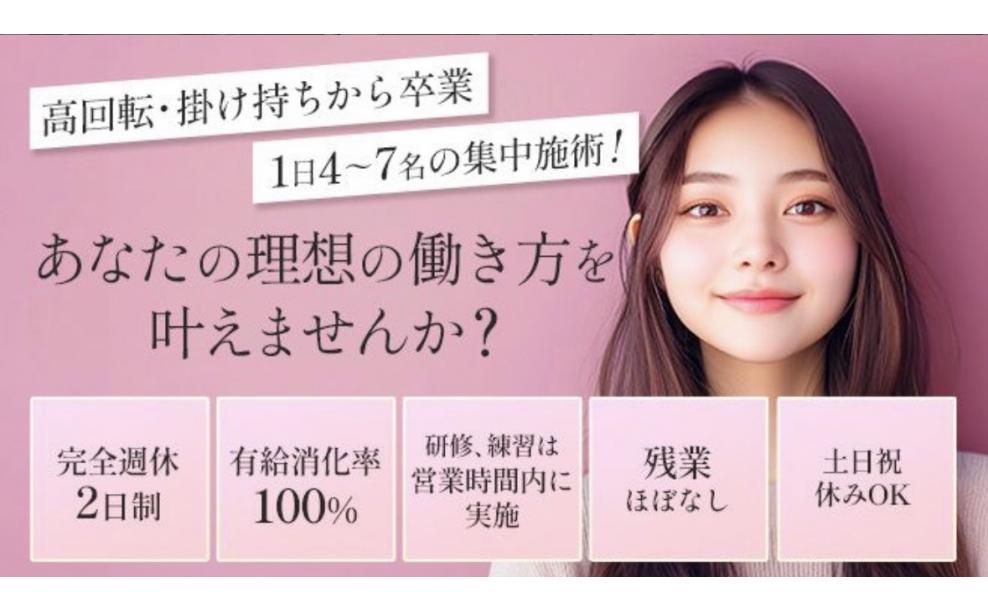 休日 | ◆完全週休2日制/サロン不定休・シフト休 稼ぎたい方は土日両日出勤がオススメですが 「毎週土日どちらかお休み」などもOK♪ 希望休100%承認なのでプライベートの 予定も立てやすいです^^ 週休2日または週休3日で選択可能なため、 仕事とプライベートのメリハリをつけて働けます!!! その他にも... ・有給休暇※100%消化/入社6か月後~取得可 ・年末年始休暇/31日~3日 ・産休・育休/入社1年後~取得可 有給休暇は100%消化なので 旅行にも行けるのが嬉しいPOINT! |
