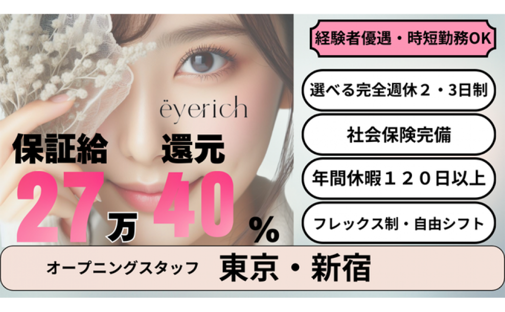 PR | まつげパーマ・眉毛専門店 「アイリッチ」 事業拡大により新宿、立川、千葉、恵比寿に新店舗OPEN! 利益はお給料と年2回の賞与で みんなにしっかり還元します♪ 高技術×丁寧な接客で、 大手集客サイトで 口コミ☆4.66の高評価のサロンです! ◎オーナーやスタッフとの人間関係が上手くいかず悩んでいる ◎回転率重視のサロンで掛け持ちがあり、体力的に限界を感じている ◎単価が低く頑張ってもお給料がなかなか上がらない ◎ライフイベントの変化があった際、働き続けられるか心配 ◎有給休暇や休みの希望が通らず、プライベートを大切にできていない そんなお悩みを抱える方! 人生を変えるチャンスかもしれません★ ぜひ、ご応募お待ちしております。 |