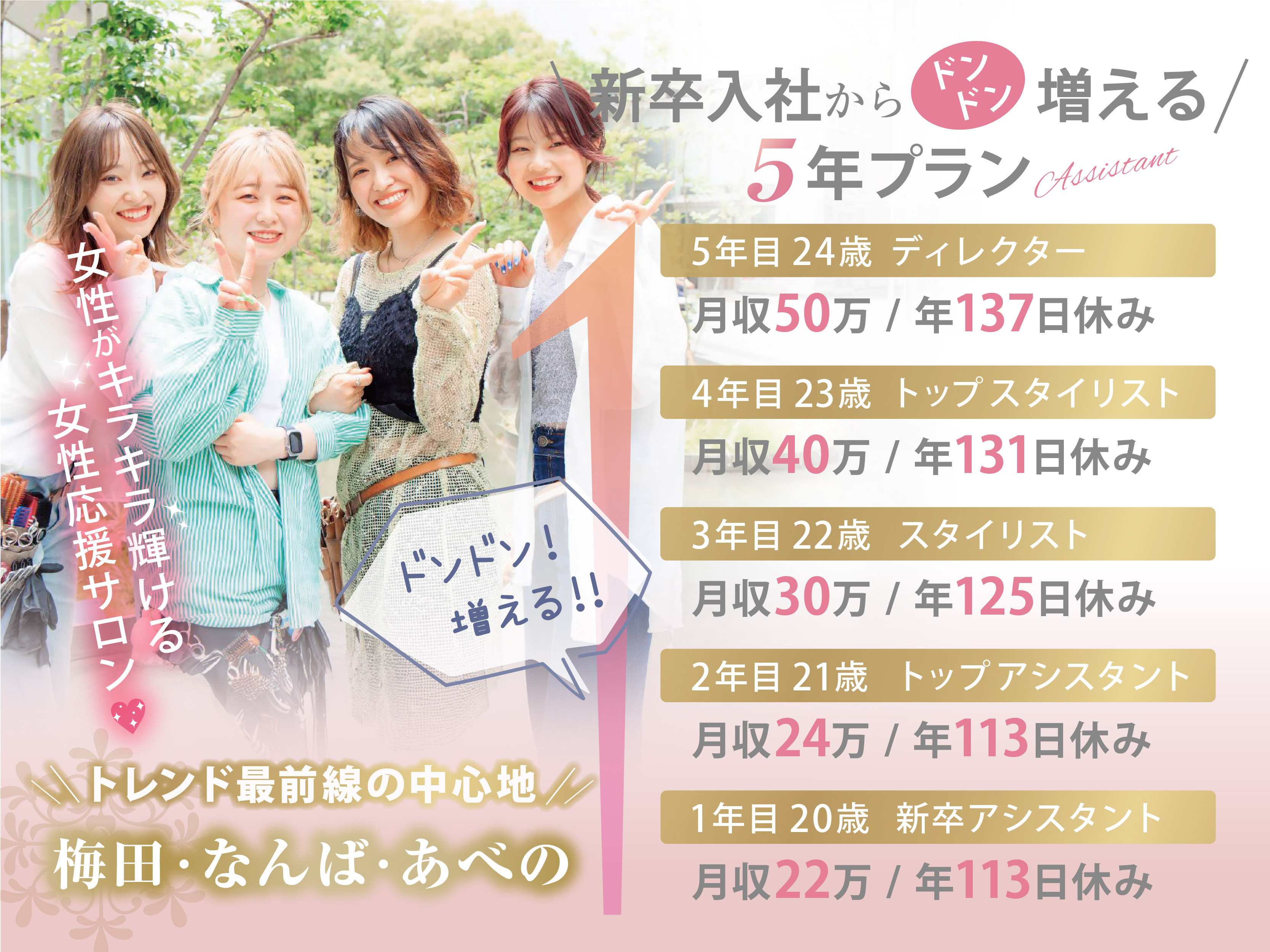 ー新卒入社からの5年プランー ■1年目 20歳 新卒アシスタント 月収22万 / 年113日休み ■2年目 21歳 トップアシスタント 月収24万 / 年113日休み ■3年目 22歳 スタイリスト 月収30万 / 年125日休み ■4年目 23歳 トップスタイリスト 月収40万 / 年131日休み ■5年目 24歳 ディレクター 月収50万 / 年137日休み |